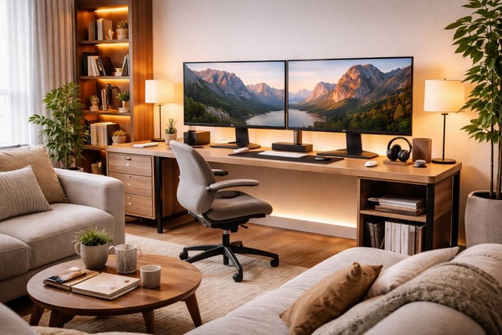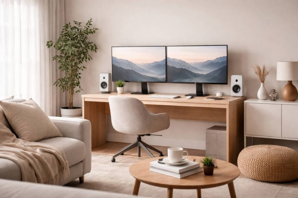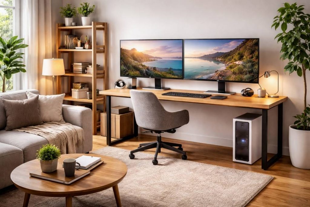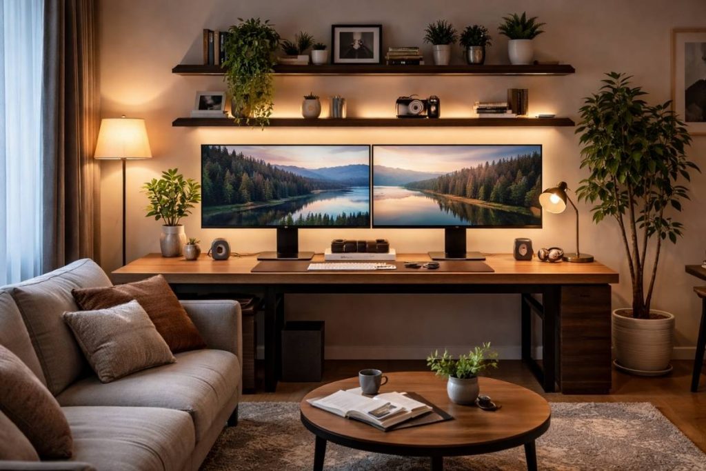 A dual monitor setup can dramatically improve workflow while still fitting into a living room environment. When designed carefully, it can feel integrated into the space rather than looking like a traditional office desk.
